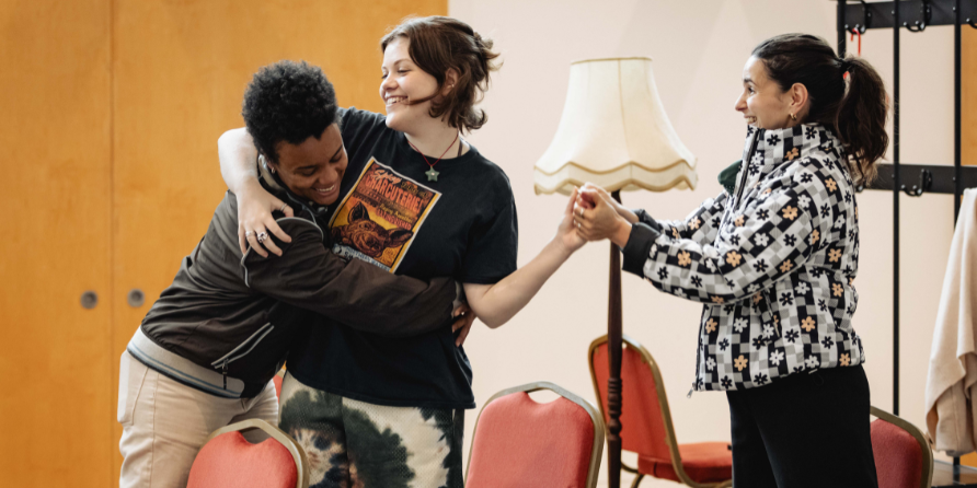 Leah Harvey, Georgie Henley and Serena Manteghi in rehearsals for The Ministry of Lesbian Affairs. Photo by Mark Senior.